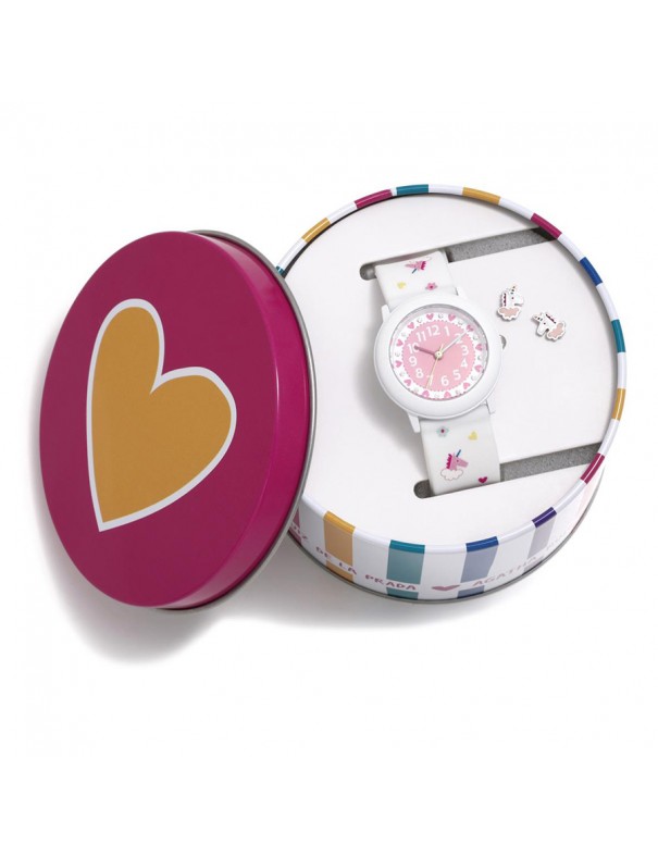 Pack Reloj Agatha Ruiz de la Prada Bombón Blanco Y Pendientes Unicornio AGR367+U. La caja es de latón pintado. La esfera tiene un diámetro de 34 mm. La pulsera es de silicona estampada con unicornios y tiene cierre de hebilla. Y pendientes de plata de ley 925 mls con forma de unicornio y esmalte, cierre de presión. Estuche lata. Garantía de tres años.