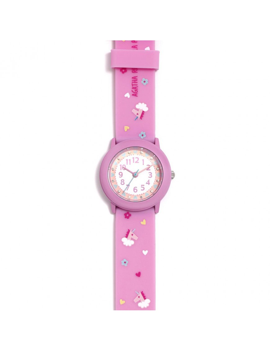 Reloj Agatha Ruiz de la Prada Bombón Rosa AGR368. La caja es de latón pintado. La esfera tiene un diámetro de 34 mm. La pulsera es de silicona estampada con unicornios y tiene cierre de hebilla. Garantía de tres años.