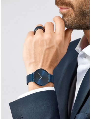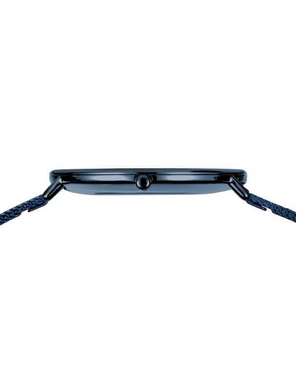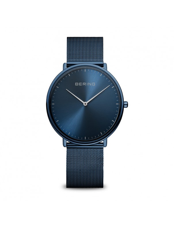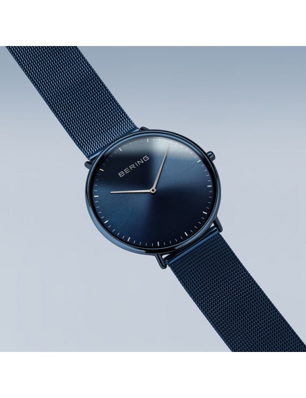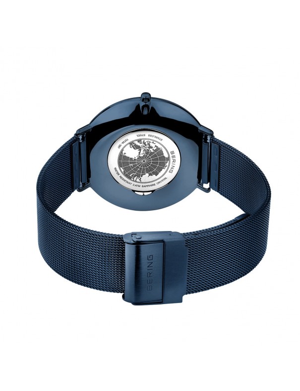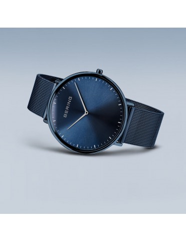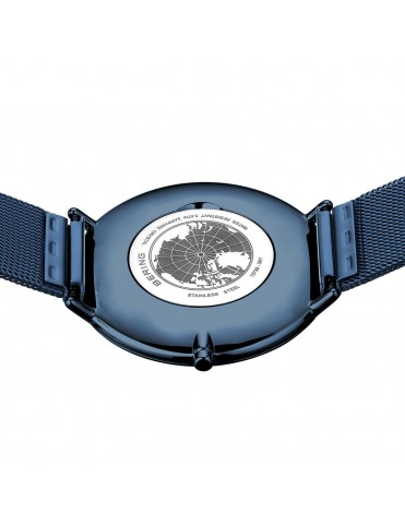 Reloj Bering Hombre 15739-397, analógico sin segundero. Caja de 39mm de diámetro. Grosor de caja 4,8mm. Cristal de zafito. Pulsera milanesa de acero en color azul. Sumergible a 3ATM, por lo que sólo soporta pequeñas salpicaduras.