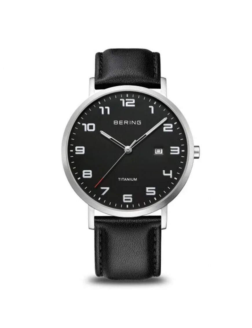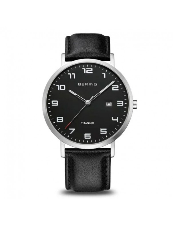 Reloj Bering Titanium para hombre 18640-402. La esfera es de titanio y mide 40 mm de diámetro. La pulsera es de piel. Incluye cristal zafiro que no se raya. Es sumergible a 5 ATM por lo que permite el nado en superficie sin inmersión (no recomendable para la pulsera de piel). Garantía de tres años.