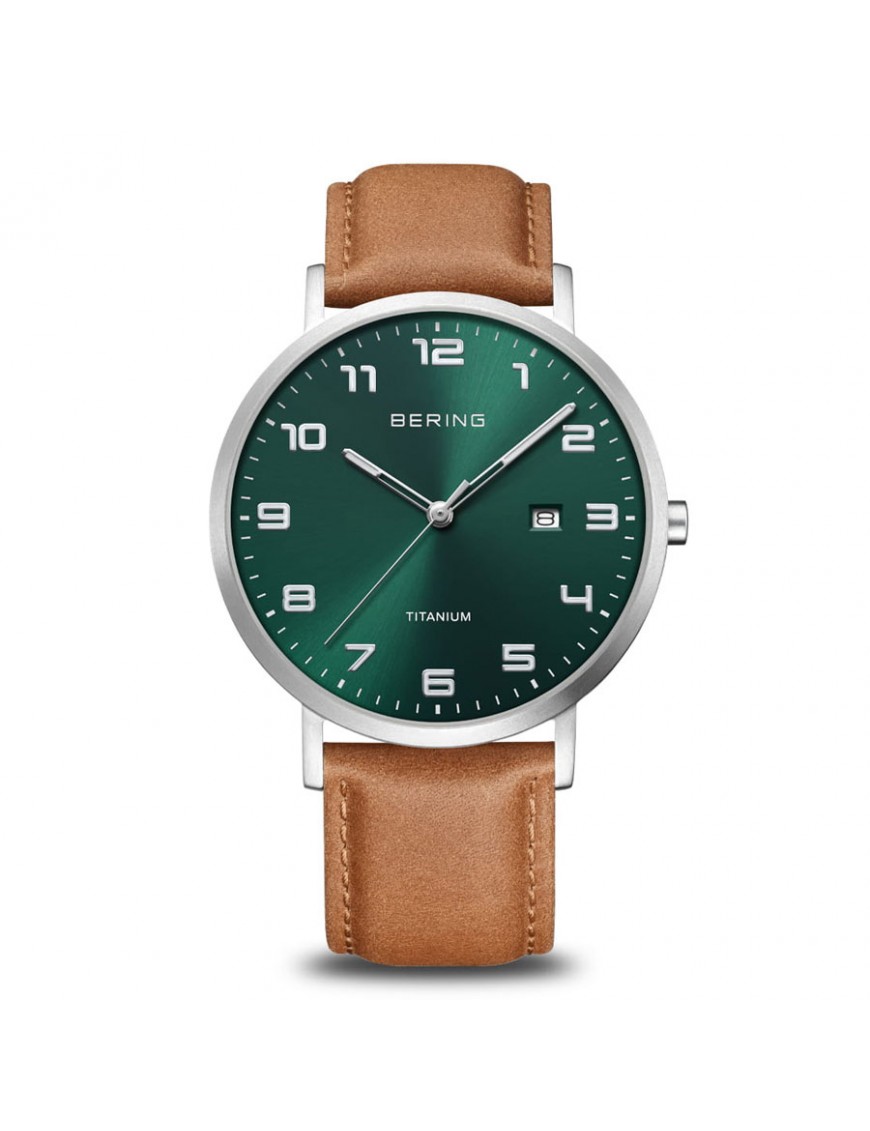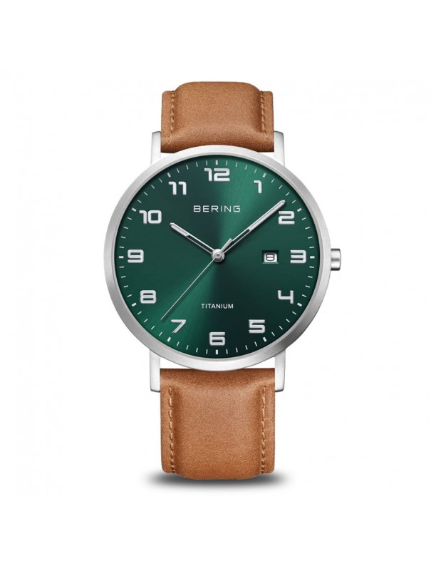 Reloj Bering para hombre 18640-568. La esfera es de titanio y mide 40 mm de diámetro. La pulsera es de piel. Incluye cristal zafiro que no se raya y calendario. Es sumergible a 5 ATM y permite el nado en superficie sin inmersión (no recomendable par ala pulsera de piel). Garantía de tres años.