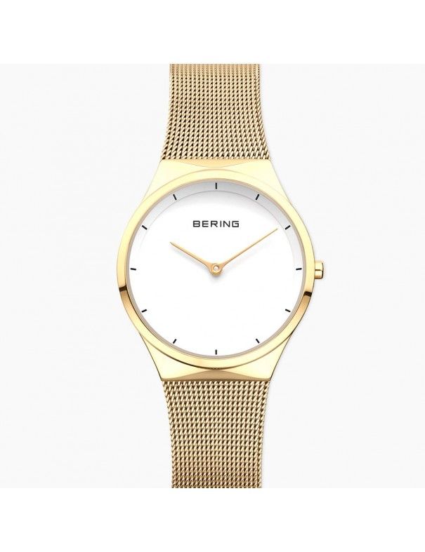 Reloj Bering Classic Mujer 12131-339. Un cristal de zafiro cuida a la esfera, la cual es de color blanca. La pulsera es de tipo malla milanesa de color oro. No querrás quitártelo de la muñeca!!