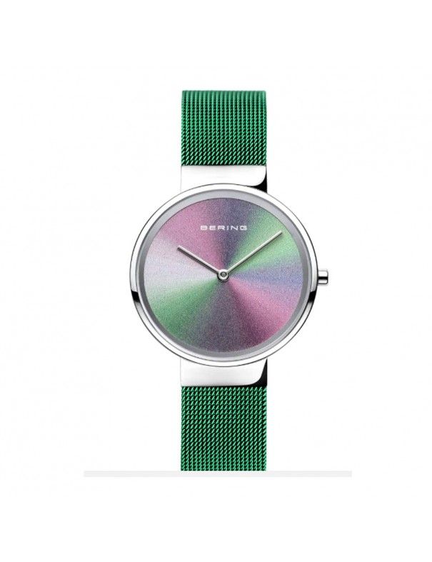Reloj Bering Mujer 10X31Anniversary1, analógico sin segundero. Caja de 31mm de diámetro. Esfera tornasolada. Pulsera milanesa de acero en color verde. Sumergible a 5ATM, por lo que es apto para ducha y baño sin inmersión. Cristal de zafiro.