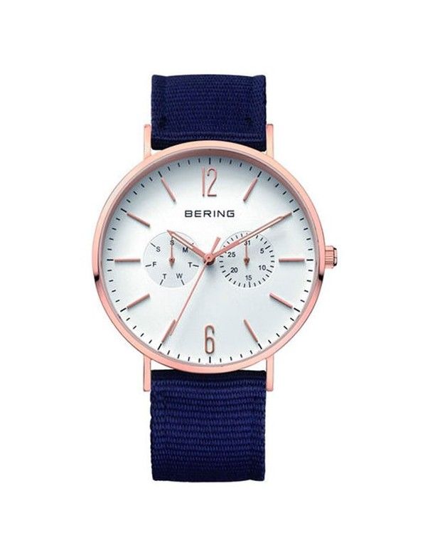 Reloj Bering Hombre Multifunción 14240-864. Es un reloj original de la marca Bering de la que somos distribuidores oficiales. Es un modelo para hombre, analógico multifunción. Su movimiento es de cuarzo alimentado con pila.La caja que encierra al mecanismo es de titanio de color oro rosado, tiene un diámetro de 40 milímetros y es sumergible a 30 metros. Un cristal de zafiro cuida a la esfera, la cual es de color blanca. Los indicadores de la hora son números arábigos. Mientras las correas son intercambiable, una textil en color azul y la otra en cuero auténtico. Los relojes Bering cuentan con una garantía de 3 años contra cualquier defecto de fabricación.