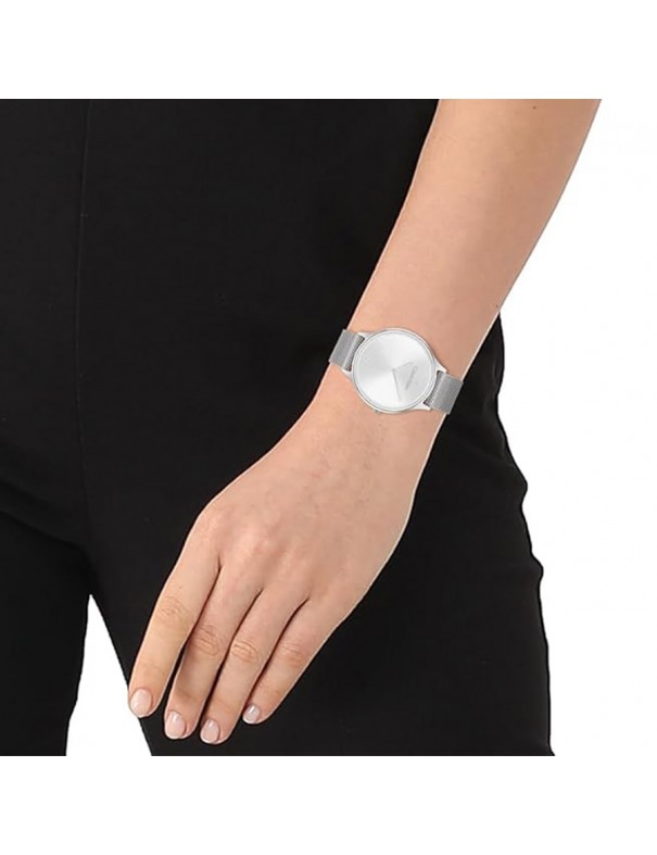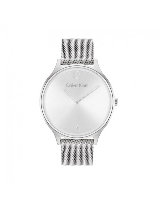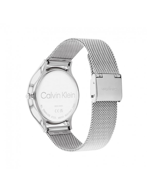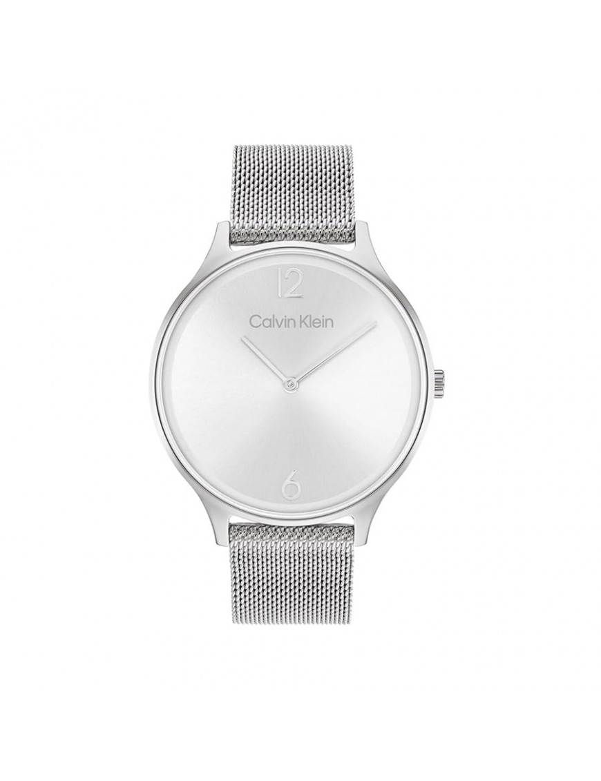 Reloj Calvin Klein Timeless Malla Acero 25200001. Caja de acero de 38 mm de diámetro con esfera en color plata bajo un cristal mineral. La correa de malla milanesa es de acero y cuenta con un cierre de presión. Sumergible hasta 30 metros. Garantía de 3 años.