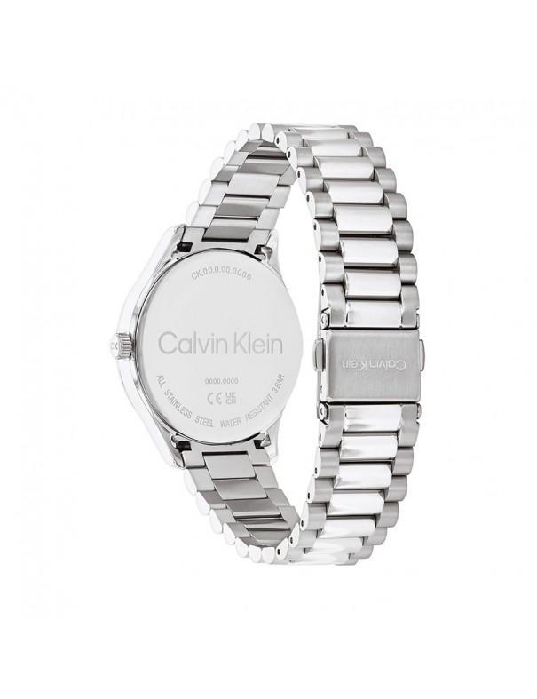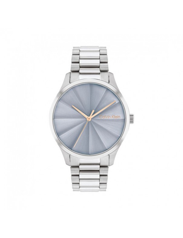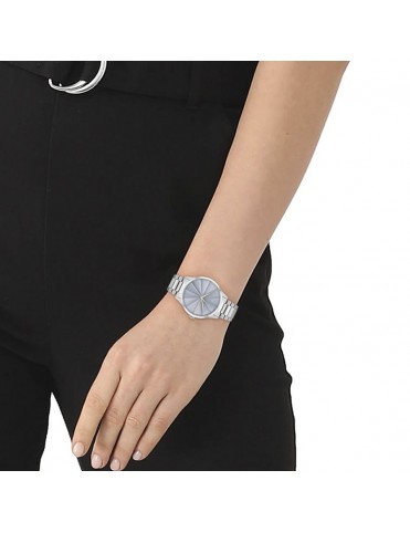 Reloj Calvin Klein Burst Mujer 25200230. Caja plateada de acero de 35 mm de diámetro con esfera azul claro con detalles laminados bajo un cristal mineral. La correa está formada por eslabones en color plata con cierre desplegable de doble pulsador. Sumergible hasta 5 ATM. Garantía de 3 años.