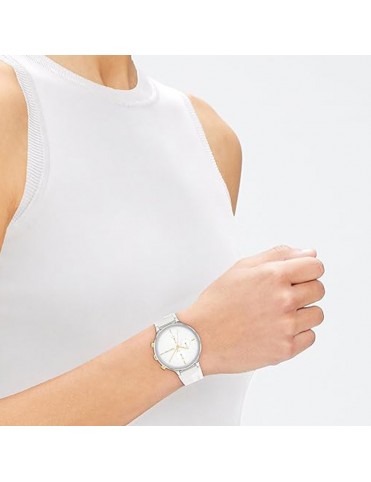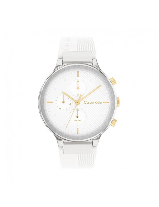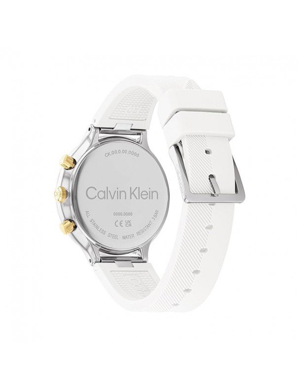 Reloj Calvin Klein Energize Multifunción Mujer 25200244. Caja de acero de 40 mm de diámetro con esfera en color blanco y 6 agujas bajo un cristal mineral. La correa es de silicona y tiene cierre de hebilla. Sumergible hasta 3ATM. Garantía de 3 años.