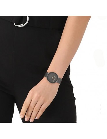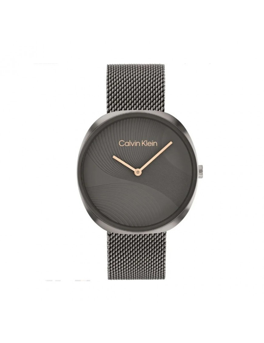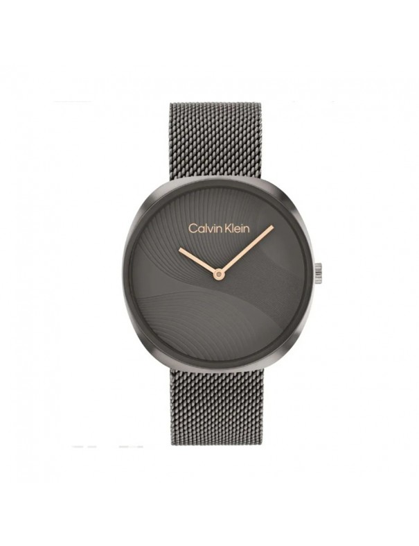 Reloj Calvin Klein Sculpt 25200248. Caja de acero de 36.6 mm de diámetro con esfera en color gris y agujas en color oro rosado bajo un cristal mineral. La correa es de malla milanesa con cierre de presión. Sumergible hasta 3 ATM. Garantía de 3 años.