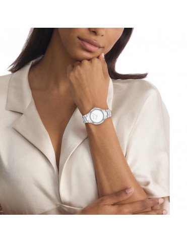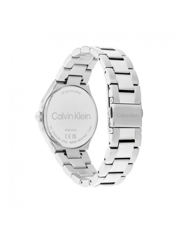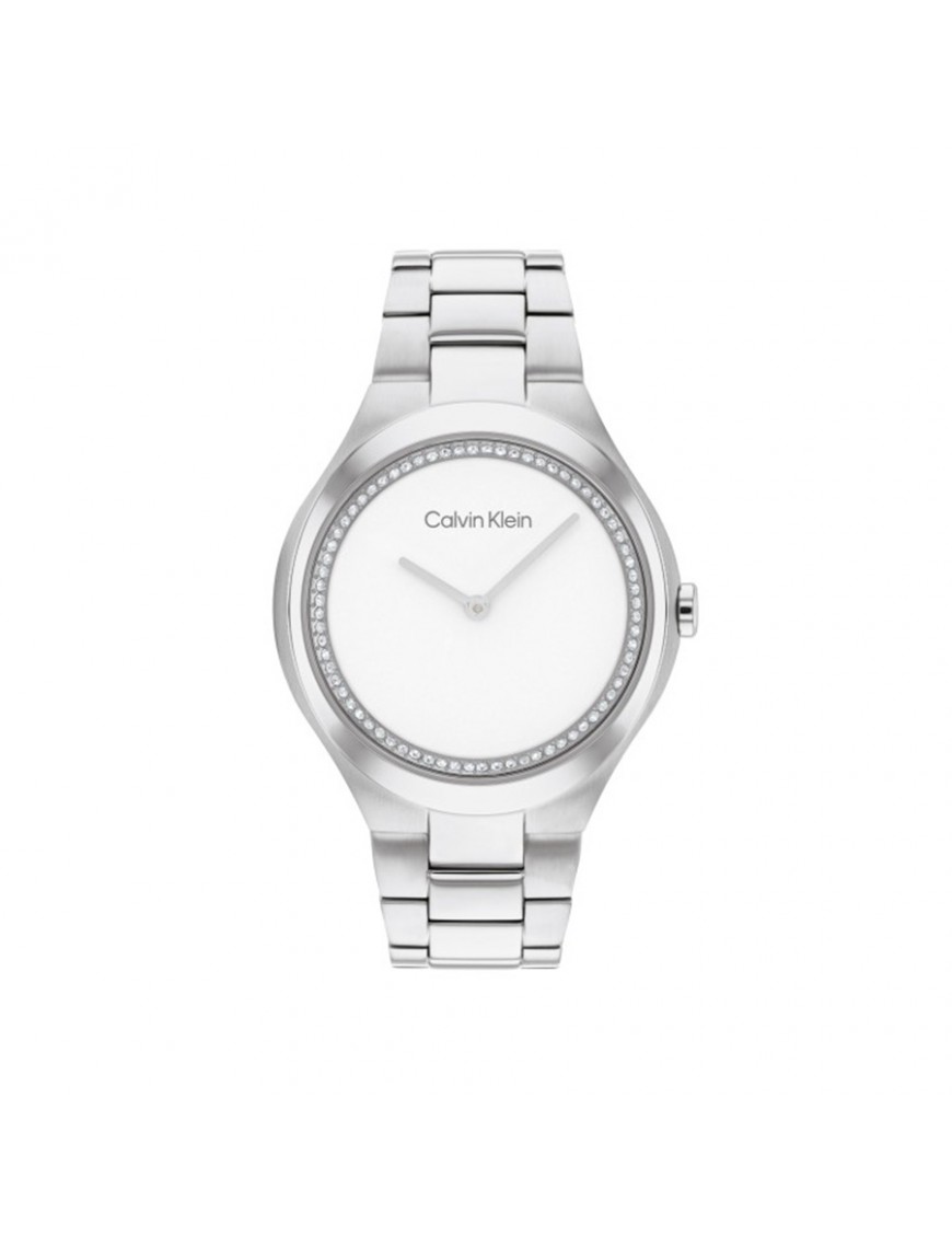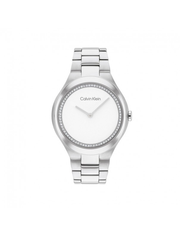 Reloj Calvin Klein Admire 25200365. Caja de acero de 36mm de diámetro con esfera en color blanco con 2 agujas en color plateado bajo un cristal mineral. La correa es de acero en color plateado formada por eslabones y cierre desplegable con doble pulsador. Sumergible hasta 3 ATM. Garantía de 3 años.