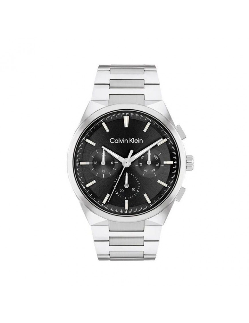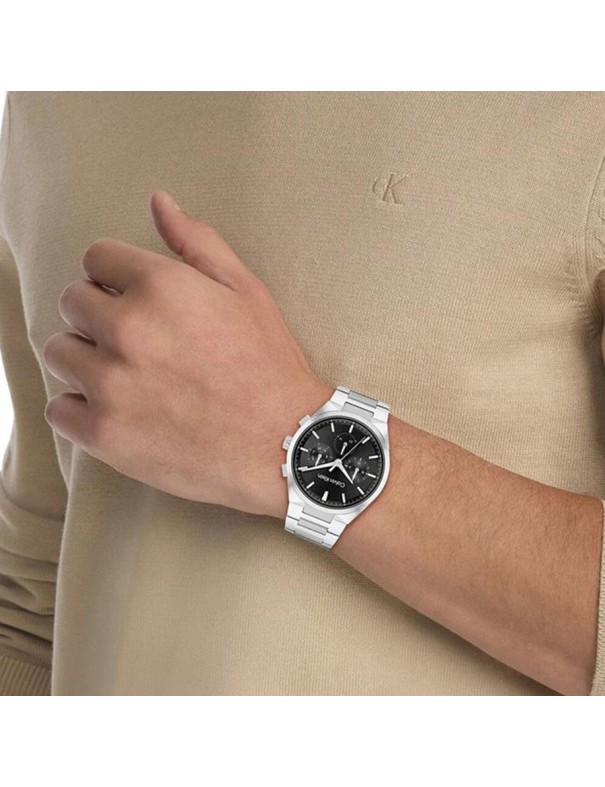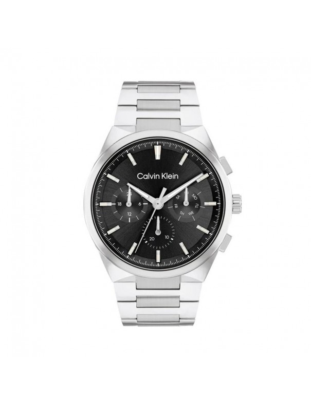 Reloj Calvin Klein Distinguish 25200459. Caja de acero de 44mm de diámetro con esfera en color negro con 6 agujas en color plateado bajo un cristal mineral. La correa es de acero en color plateado formada por eslabones y cierre desplegable con doble pulsador. Sumergible hasta 3 ATM. Garantía de 3 años.
