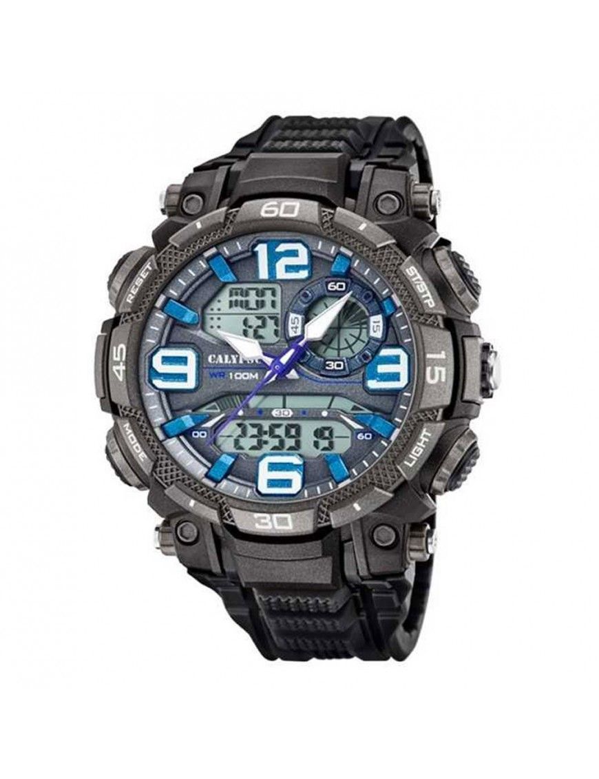 Reloj Calypso Hombre X-Trem K5793/2, analógico y digital. Caja de 54mm de diámetro de plástico , agujas e indicadores luminiscentes. Función de Alarma, Cronómetro, Cuenta regresiva y Segunda hora. Pulsera de caucho negro. Sumergible 10ATM, por lo que es apto para ducha y baño con inmersión.