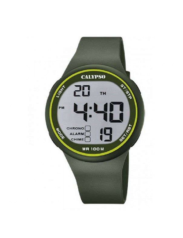 Reloj Calypso Color Splash Hombre K5795/5, digital. Caja de 44mm de diámetro de plástico y pulsera de caucho verde. Función de Alarma, Cronómetro, Cuenta regresiva y Segunda hora. Sumergible a 10ATM, por lo que es apto para ducha o baño sin inmersión.