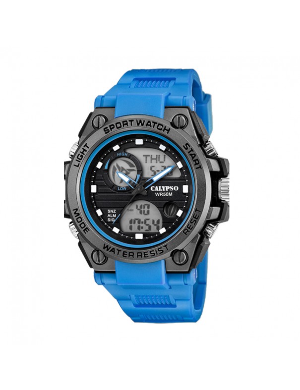 Reloj Calypso analógico digital para hombre K5854/1 Azul. La caja es de plástico y la pulsera de caucho con hebilla. Es un modelo analógico y digital con crono, luz y calendario. Es sumergible a 5 ATM y cuenta con tres años de garantía.