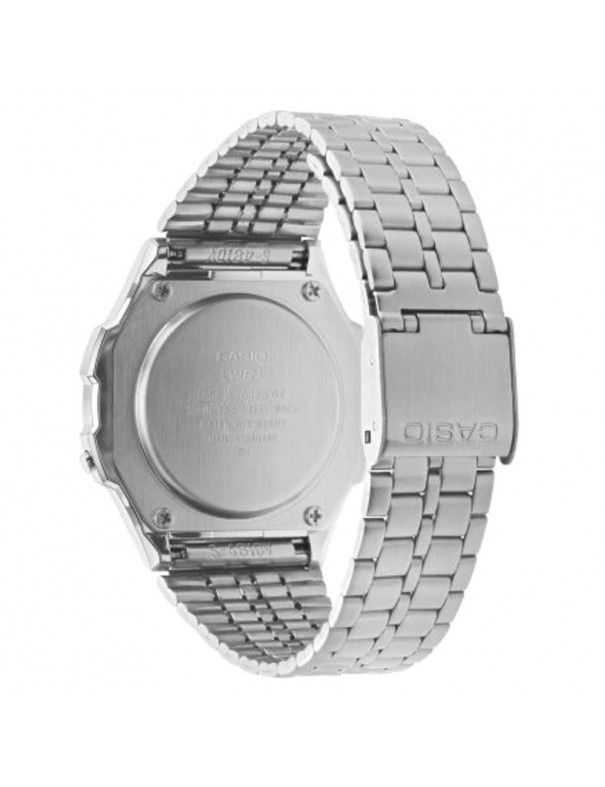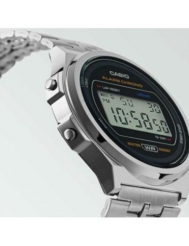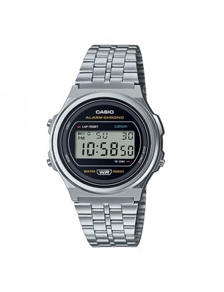 Reloj Casio Unisex A171WE-1AEF, digital. Caja de resina 38X36mm. Cristal acrílico. Pulsera de acero. Función de alarma, cronómetro, formato de 24 horas, luz led, formato de 24 horas... Sumergible a 3ATM, por lo que sólo soporta pequeñas salpicaduras.