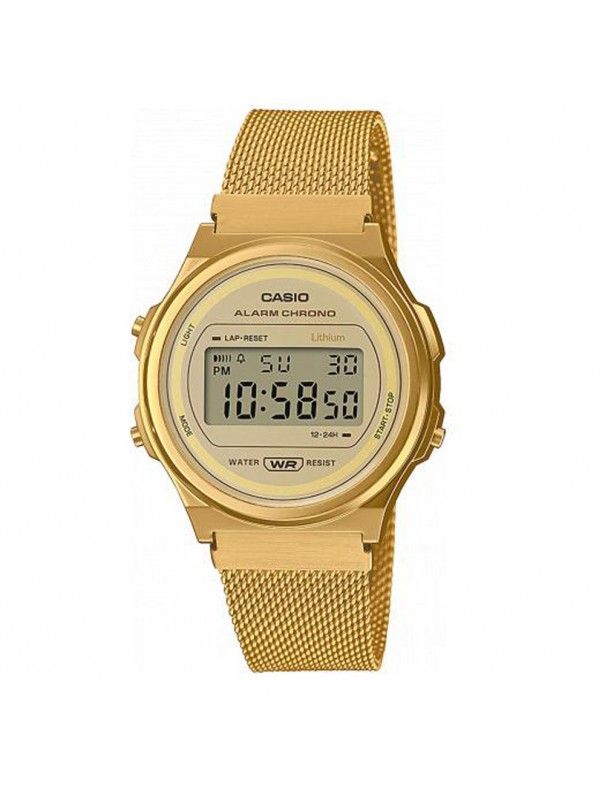 Reloj Casio Unisex A171WEMG-9AEF, digital. Caja de resina de 38X36mm. Pulsera de acero en color dorado. Cristal acrílico. Luz led. Función de cronómetro, indicador de hora en formato 2/24 horas y alarma. Sumergible a 3ATM, por lo que sólo soporta pequeñas salpicaduras.