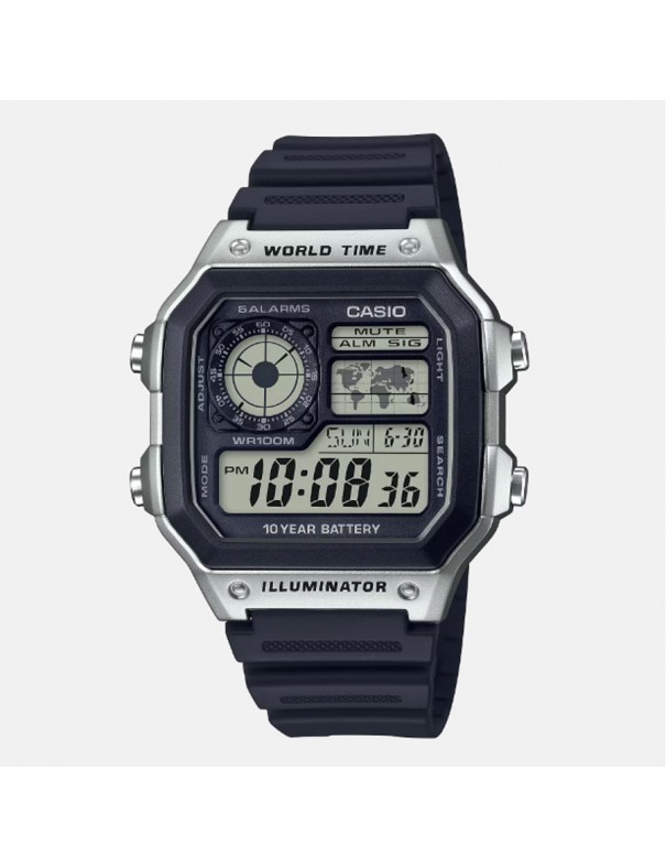 Reloj Casio para hombre AE-1200WH-1CVEF. La esfera es de resina y mide 45 mm de alto. Las pulsera también es de resina y lleva cierre de hebilla. Dispone de cronómetro, alarma, hora mundial, calendario perpetuo, modo 12/24 horas y luz led.
