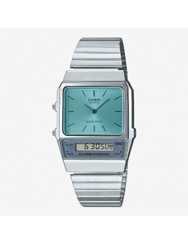 Reloj Casio unisex AQ-800EC-2AEF. Es un modelo analógico y digital y la esfera es de resina y mide 41 mm de alto. La pulsera es de acero con cierre ajustable. Dispone de cronómetro, alama, calendario día y mes y modo 12/24 horas. No es sumergible (3ATM) y sólo admite leves salpicaduras. Garantía de tres años.
