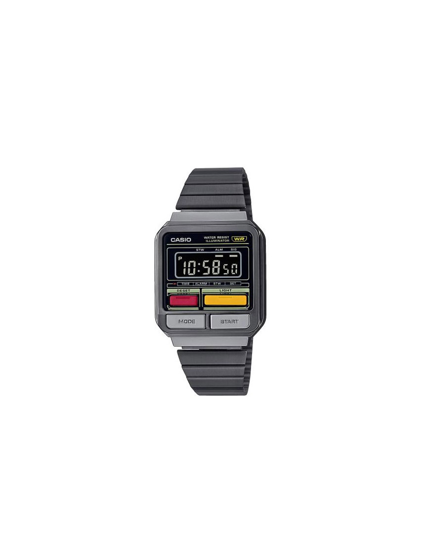 Reloj Casio Vintage AA120WEGG-1BEF, digital. Caja de resina de 40x34x9mm. Cristal acrílico. Luz led. Correa de acero ajustable. Función de hora, cronómetro, alarma y calendario automático. Resistencia ISO22810por lo que sólo soporta pequeñas salpicaduras.