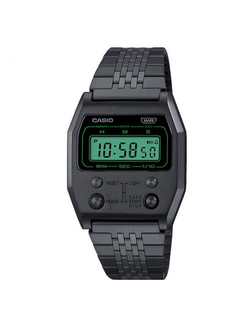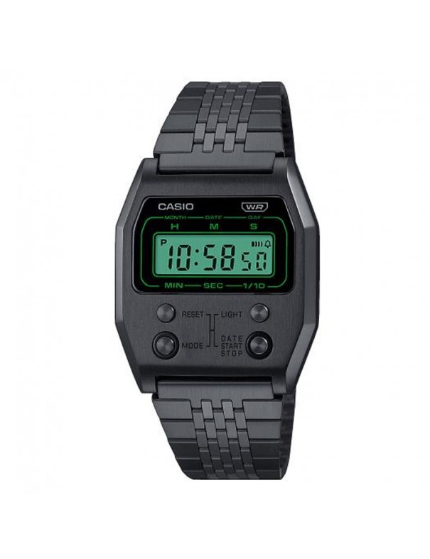 Reloj Casio Vintage unisex A1100B-1EF. La esfera es de acero y mide 35 mm de diámetro. La pulsera es del mismo material. Tiene luz led, cronómetro, alarma y calendario. No es sumergible (3ATM) y sólo admite leves salpicaduras. Garantía de tres años.