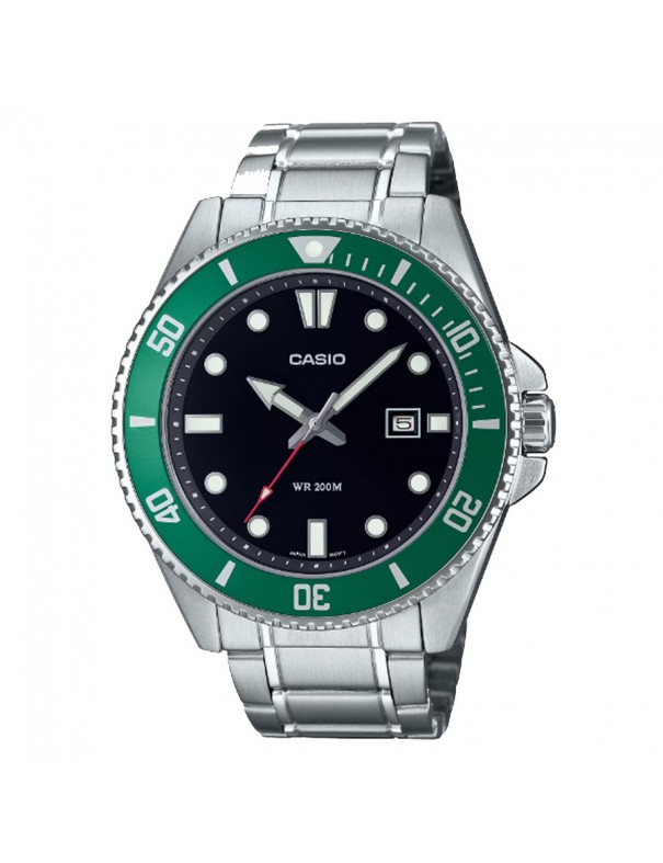 Reloj Casio para hombre MDV-107D-3AVEF. La esfera es de acero y aluminio y mide 44 mm de diámetro. La pulsera es de acero con cierre de seguridad. Incluye calendario. Es sumergible a 20 ATM y permite el buceo con botella. Garantía de tres años.