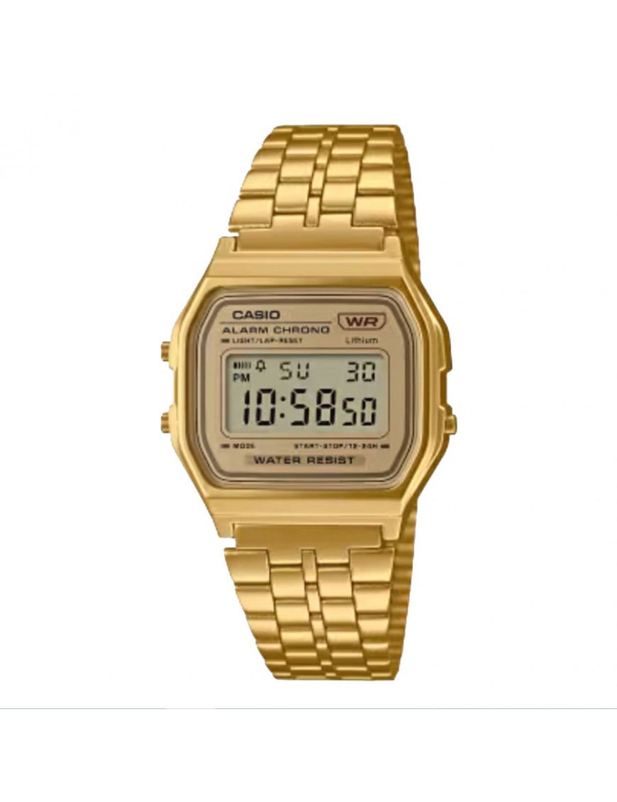 Reloj Casio Unisex A158WETG-9AEF. La caja es de resina dorada y mide 33 mm de diámetro. La pulsera es de acero dorado ajustable. Cuenta con alarma, luz led, calendario, cronógrafo y modo 12/24 horas. No es sumergible (3ATM) y tiene tres años de garantía.