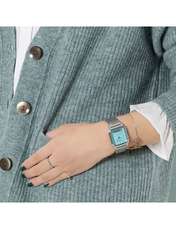 Reloj Casio Retro Unisex AQ-230A-2A2MQYES. La caja es de resina plateada y mide 30 mm de ancho. La pulsera es de a cero con cierre ajustable. Incluye función digital y analógica, cronómetro, alarma, modo 12/24 horas y calendario. No es sumergible (3 ATM) y tiene tres años de garantía.