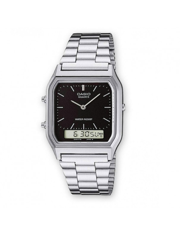 Reloj Casio Vintage AQ-230A-1DMQYES, analógico y digital. Caja de resina 39x30x8mm. Resina de vidrio. Armix de acero. Función de hora, cronómetro, alarma, cuenta regresiva, formato 12/24horas y hora dual. Sumergible 3ATM, por lo que sólo soporta pequeñas salpicaduras.