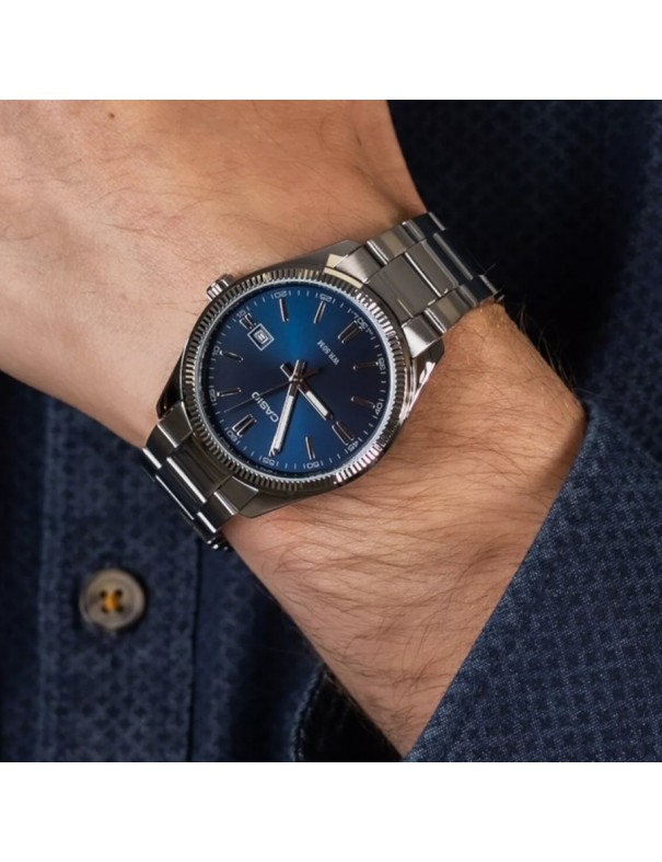 Reloj Casio Timeless Collection MTP-1302PD-2AVEF. La esfera lleva un bisel radiado ionizado. La esfera es de color azul y tiene un cristal mineral. La correa es de acero y tiene cierre de triple pliegue. Incluye calendario. Sumergible hasta 5 bares. Garantía de 3 años.