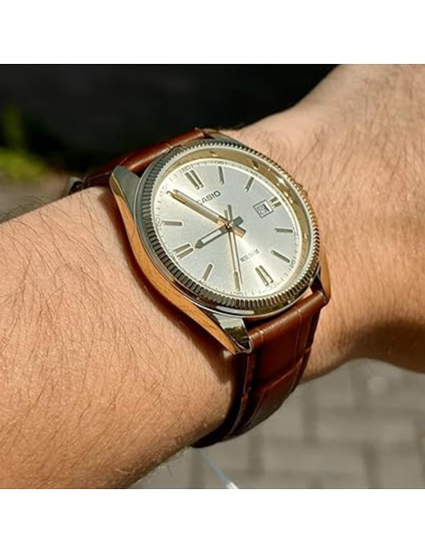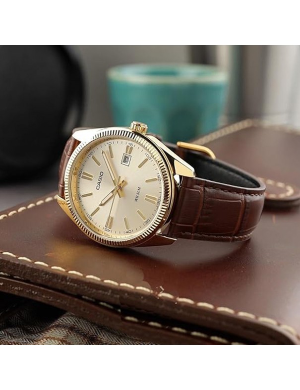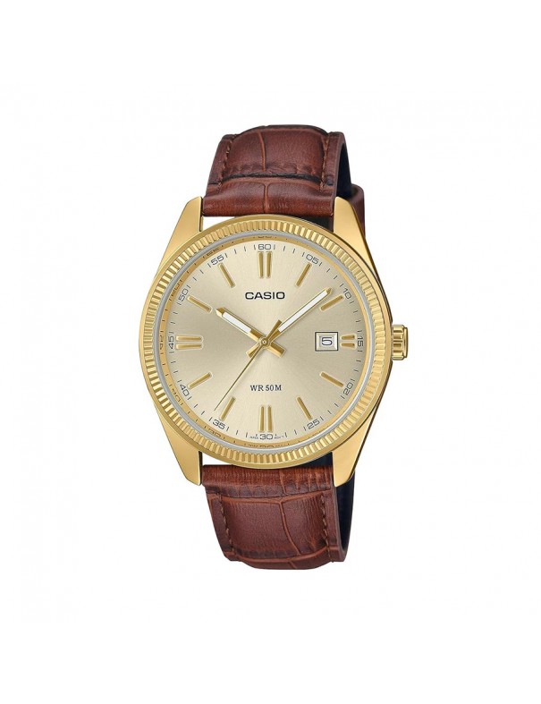Reloj Casio Timeless Collection MTP-1302PGL-9AVEF. Caja chapada en iones de color oro con esfera en color dorado bajo cristal mineral. La correa es de piel en color marrón y tiene cierre de hebilla. Incluye calendario. Sumergible hasta 5 bares. Garantía de 3 años.