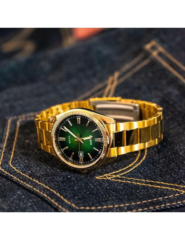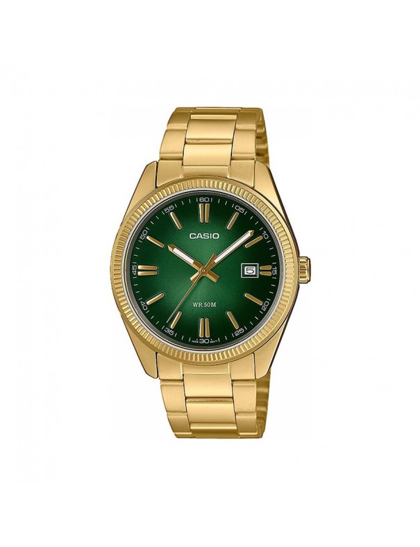 Reloj Casio Timeless Collection MTP-1302PGC-3AVEF. Caja y bisel chapados en iones de color oro con esfera en color negro y verde en degradado bajo cristal mineral. La correa es de acero y tiene triple cierre. Incluye calendario. Sumergible hasta 5 bares. Garantía de 3 años.