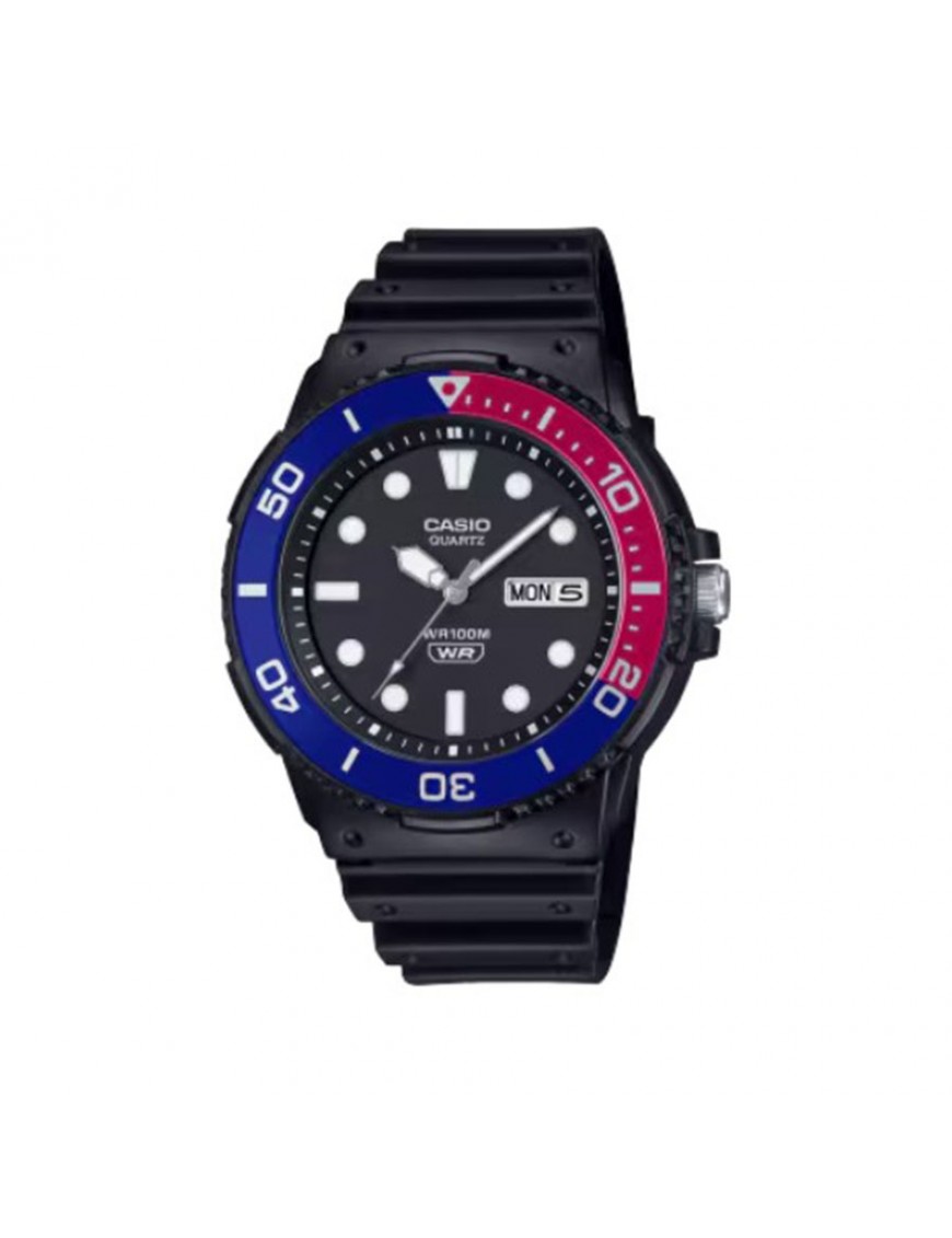 Reloj Casio MRW-230H-1E2VEF. Reloj analógico deportivo con inspiración marina. Su bisel giratorio incorpora un anillo de aluminio en rojo y azul que aporta un toque audaz. Cuenta con indicación de día y fecha. Su correa de resina negra ofrece comodidad y durabilidad, perfecta para el uso diario y actividades acuáticas. Resistente al agua hasta 10 bares. Garantía de 3 años.