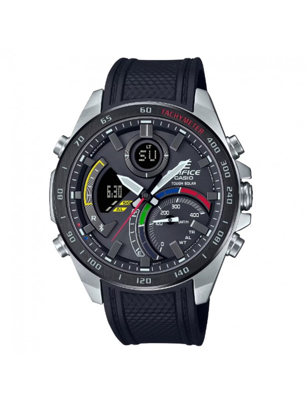 Reloj Casio Edifice ECB-900MP-1AEF para hombre. La esfera es de acero y mide 48 mm de diámetro. La pulsera es de resina con hebilla. Se alimenta con el sistema Tough Solar y tiene funcionalidad Smartphone link mediante Bluetooth. Entre sus funciones cuenta con hora mundial, cronómetro, temporizador, 5 alarmas, luz led, calendario, indicador de carga de batería y formato 12/24 horas. Es sumergible a 10 ATM, por lo que permite el buceo sin botella. Garantía de tres años.