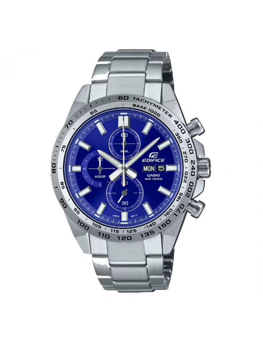 Reloj Casio Edifice para hombre EFR-574D-2AVUEF. La esfera es de acero y mide 42 mm de diámetro. La pulsera es del mismo material con triple cierre de seguridad. Incluye cronógrafo, taquímetro y calendario fecha/día. Es sumergible a 10 ATM y permite el buceo sin botella. Garantía de tres años.