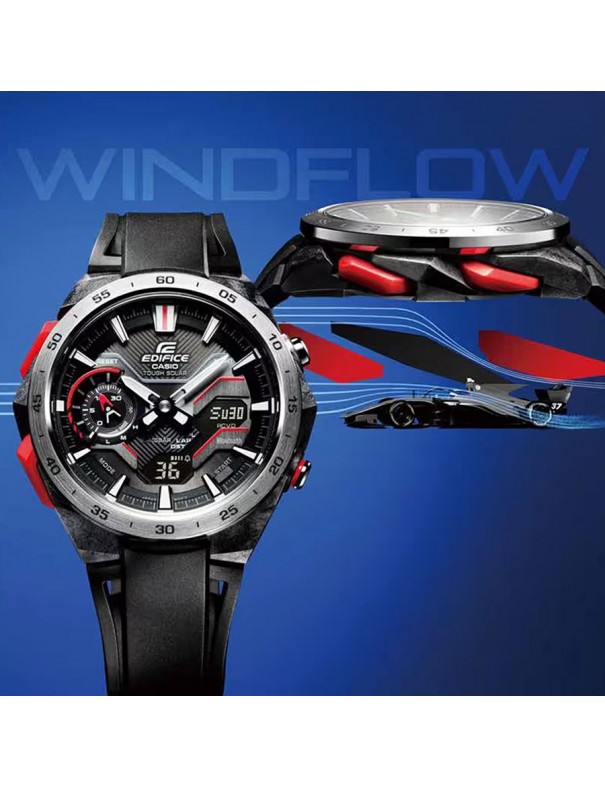 Reloj Casio Edifice Windflow para hombre ECB-2200P-1AEF. La caja es de carbono y acero y mide 48 mm de diámetro. La pulsera es de resina. Es un modelo Tough Solar con carga mediante energía solar, Smart Mobile Link con múltiples opciones Smart a través de Bluetooth y está inspirado en la Fórmula 1. Incluye temporizador, calendario hasta 2099, cronógrafo, 5 alarmas diarias, modo 12/24 horas y luz led entre otras funciones. Es sumergible a 10 ATM y tiene tres años de garantía.
