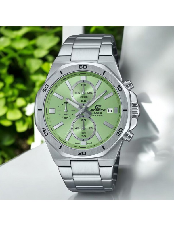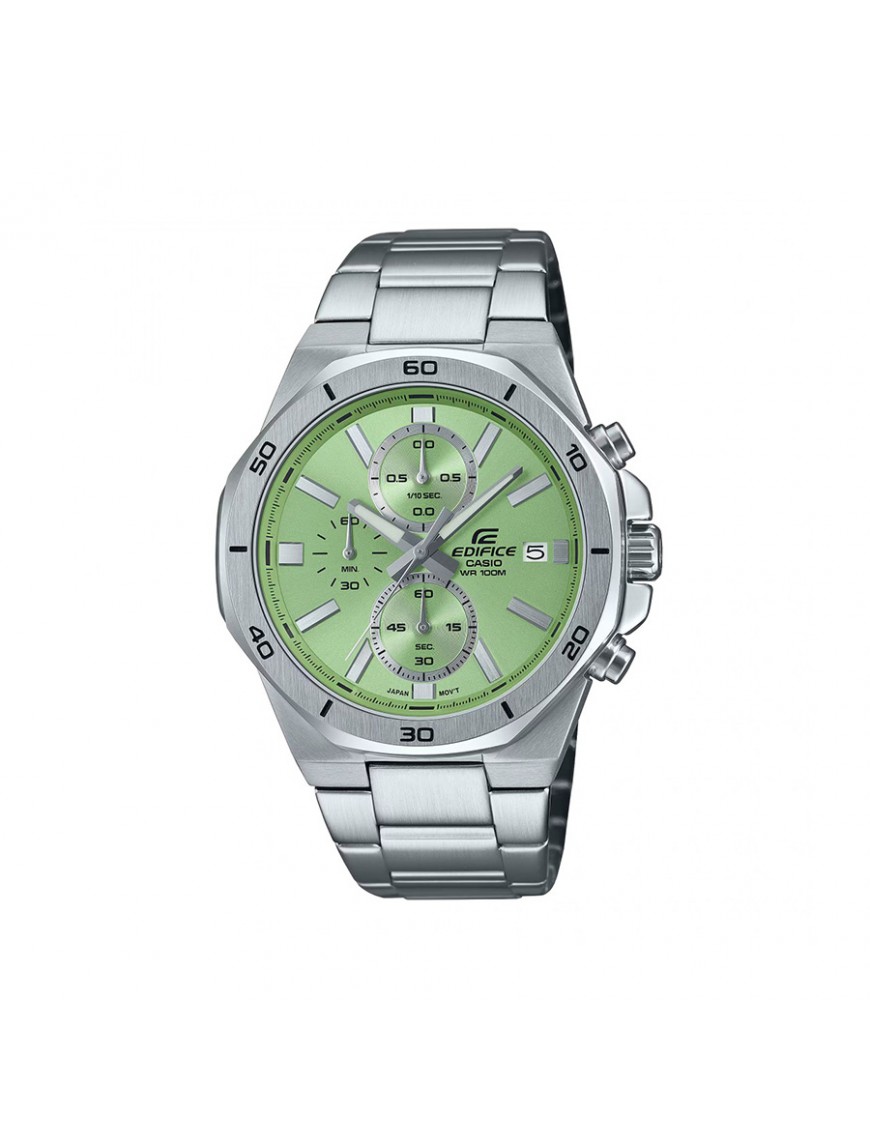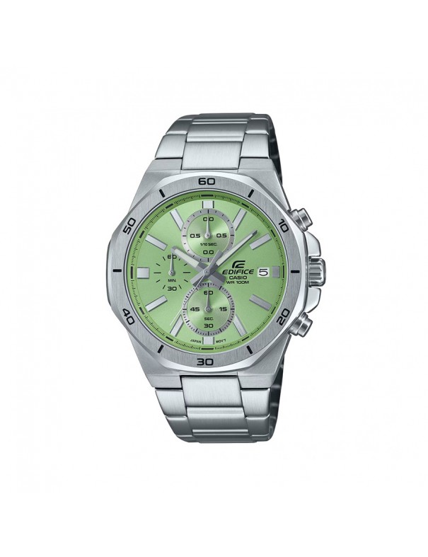 Reloj Casio Edifice Cronógrafo EFV-640D-3AVUEF. Bisel octogonal de acero inoxidable con esfera en color verde claro con 6 agujas bajo cristal mineral. La correa es de acero e incluye cierre de triple pliegue. Tiene función de cronógrafo e incluye calendario. Sumergible hasta 10 bares. Garantía de 3 años.