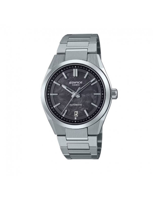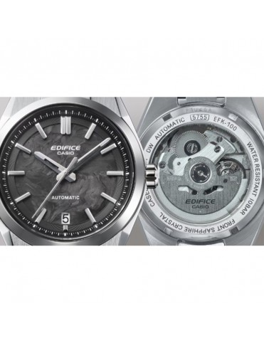 Reloj Casio Edifice Automático Esfera Gris EFK-100CD-1AER. Cuenta con caja y correa de acero inoxidable plateado, esfera en carbono forjado gris antracita, cristal de zafiro, movimiento mecánico automático con reserva de unas 40 horas y resistencia al agua hasta 10 bar.