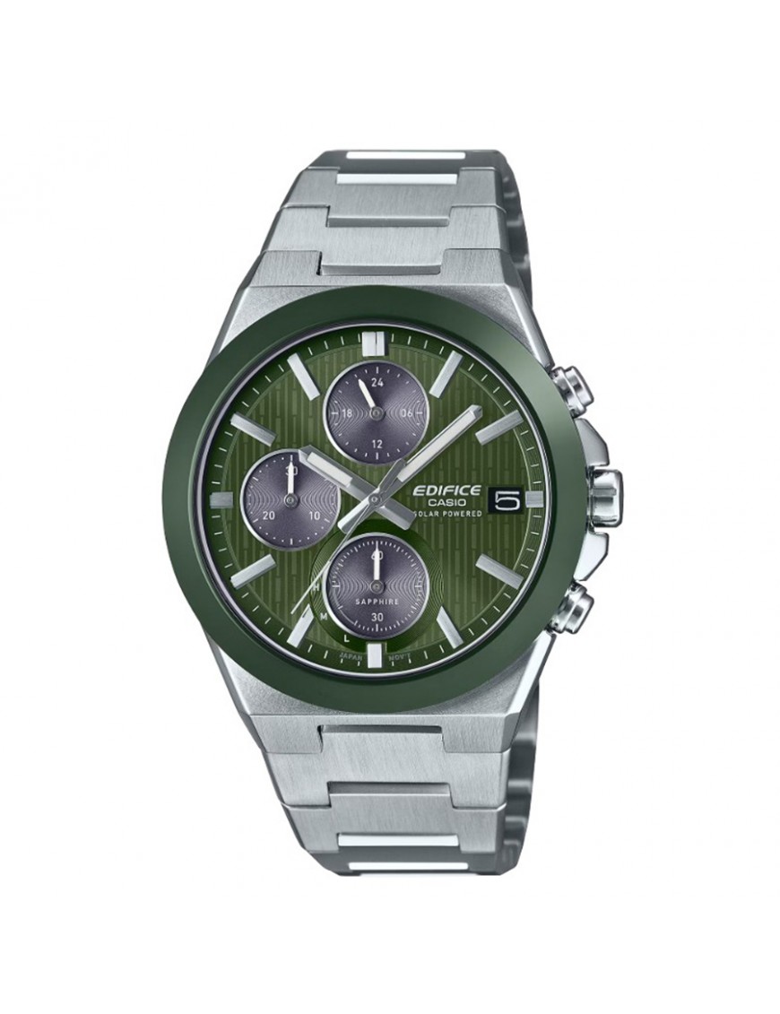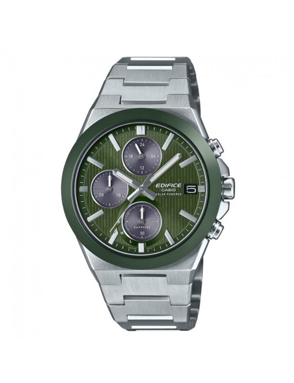 Reloj EDIFICE Cronógrafo Solar EFS-S650D-3AEF. Caja y brazalete planos de acero inoxidable con acabado espejo y satinado, bisel cerámico verde de alta resistencia a los arañazos y esfera con elegante relieve. Movimiento de cuarzo solar con cronógrafo y fecha, protegido por cristal de zafiro. Diseñado con inspiración automovilística, combina durabilidad y estilo deportivo. Resistente al agua hasta 10 bar. Garantía de 3 años.