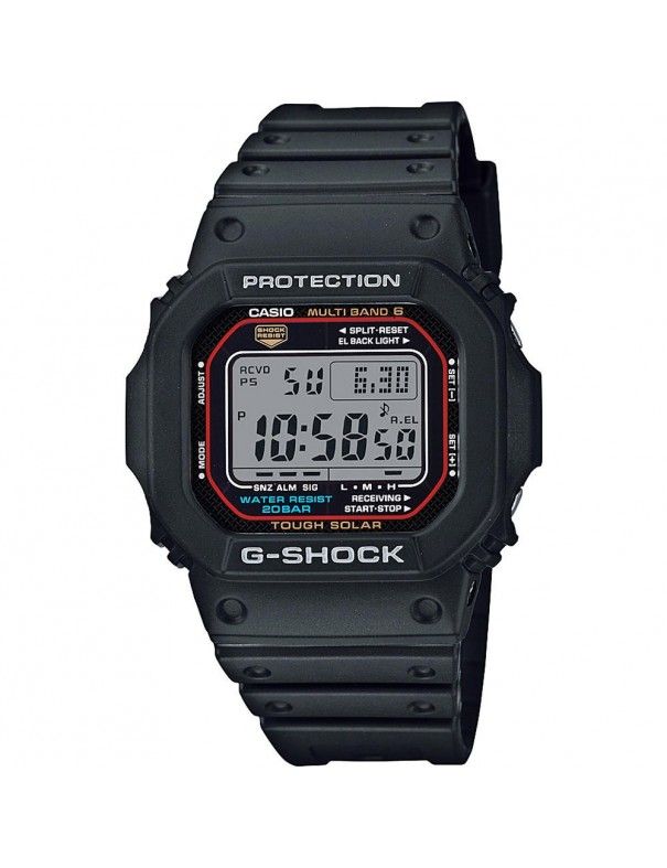 Reloj Casio G-Shock Hombre GW-M5610-1ER, digital con caja de 43mm y pulsera de caucho negro. Dispone de recepción de radiofrecuencia para mostrar siempre la hora exacta, hora universal, cronómetro, temporizador, 5 alarmas, despertador, hora mundial y calendario automático. Recoge la energía solar, acumulando la sobrante en una batería. Cristal mineral. Sumergible a 20ATM, por lo que es apto para baño con inmersión (inmersión con botella). Garantía de dos años contra defectos de fabricación.