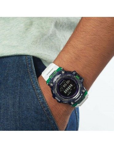 Reloj Casio Smart G-Shock GBD-100SM-1A, reloj digital con Smartphone Link (el reloj se conecta con el Smartphone de forma inalámbrica, mediante Bluetooth y ofrece así acceso a numerosas funciones). Caja de resina, esfera de 58mm de diámetro y pulsera de caucho blanco. Cristal mineral. Función de calendario, Localizador de teléfono, Hora universal, Despertador, 4 Alarmas con vibración, Sensor de aceleración, Contador de pasos, Planificación y Análisis de entrenamiento y Cálculo de consumo de calorías. Sumergible a 20ATM, por lo que es apto para ducha y baño con inmersión (inmersión con botella).