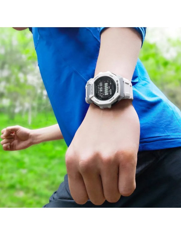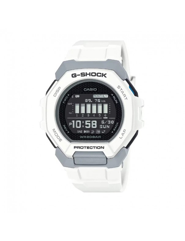 Reloj G-Shock GBD-300-7ER. La carcasa, bisel y la correa están fabricado con resina biológica lo que le hace resistente a posibles golpes. El cierre es de hebilla. Incluye funciones de entrenamiento, visualización de distancia, velocidad y otros valores; tiempos de vuelta, pausa automática, configuración de alerta de objetivo y personalización de la pantalla de entrenamiento. Sumergible hasta 20 bares, Garantía de 3 años.