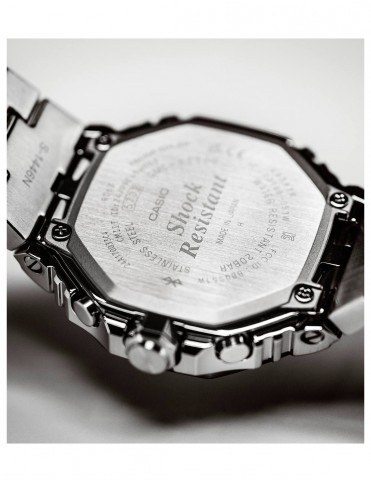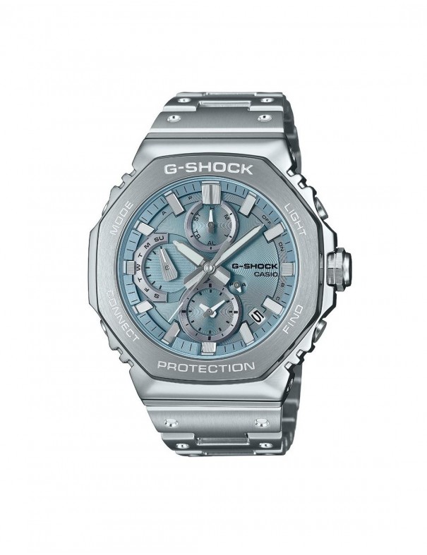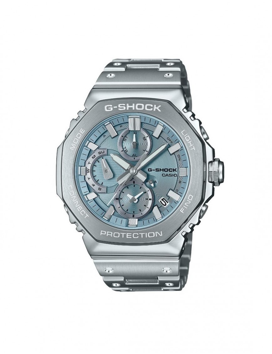 Reloj Casio G-Shock Cronógrafo Azul GMC-B2100AD-2AER. Fabricado completamente por acero inoxidable. La caja es octogonal y contiene la esfera en color azul claro con 6 agujas bajo un cristal de mineral. Está equipado con bluetooth para conectarlo fácilmente al smartphone además de funciones como cronómetro, temporizador, alarma, iluminación y calendario. Cuenta con tecnología tough solar (alimentado por energía solar). Sumergible hasta 20 bares. Garantía de 3 años.