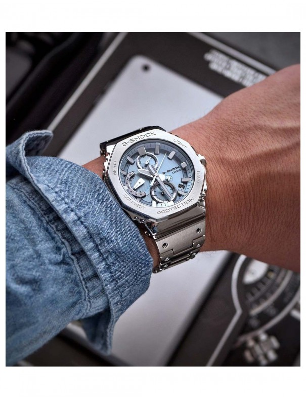 Reloj Casio G-Shock Cronógrafo Azul GMC-B2100AD-2AER. Fabricado completamente por acero inoxidable. La caja es octogonal y contiene la esfera en color azul claro con 6 agujas bajo un cristal de mineral. Está equipado con bluetooth para conectarlo fácilmente al smartphone además de funciones como cronómetro, temporizador, alarma, iluminación y calendario. Cuenta con tecnología tough solar (alimentado por energía solar).
