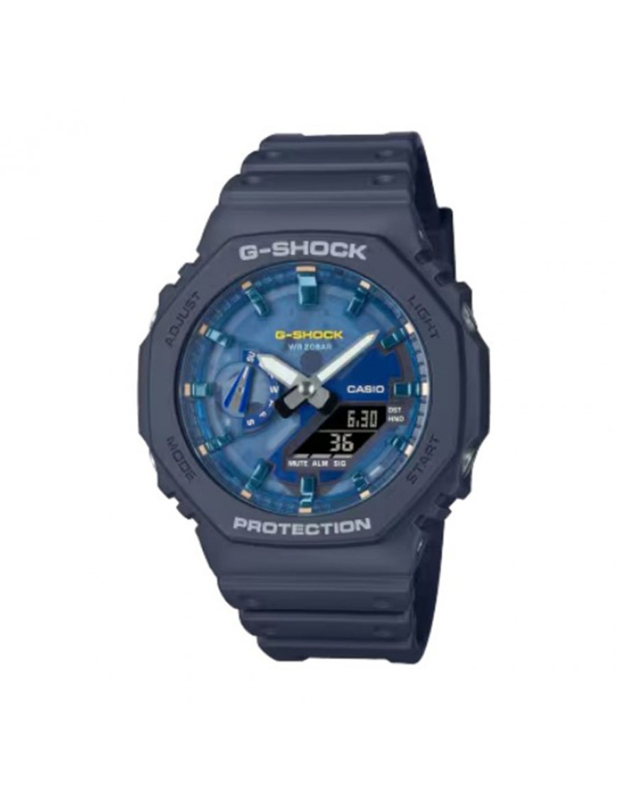 Reloj Casio G-SHOCK GA-2100AS-2AER. Destaca por su diseño octogonal delgado y un estilo inspirado en los oasis, con caja y correa en gris-azul y esfera azul transparente. Fabricado con materiales resistentes y la estructura G-SHOCK clásica, ofrece resistencia a los golpes y una estética deportiva ideal tanto para looks urbanos como marinos. Un reloj versátil y con personalidad para el día a día. Sumergible hasta 20 bares. Garantía de 3 años.