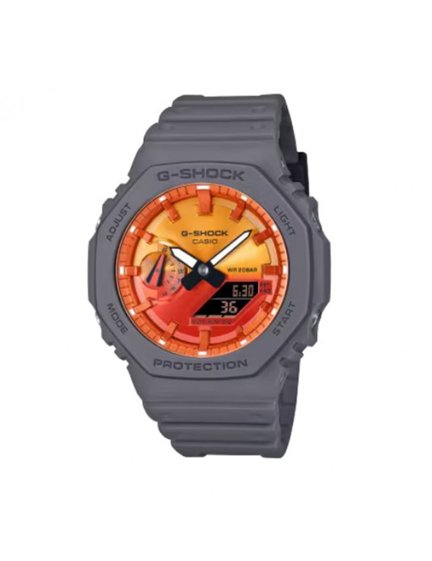 Reloj Casio G-SHOCK GA-2100FL-8AER. Destaca por su diseño audaz con gradaciones de color inspiradas en llamas, reflejando la energía y pasión del espíritu G-SHOCK. Con estructura resistente a los golpes y luz LED integrada, combina funcionalidad con un estilo vibrante. Este modelo ofrece una esfera naranja sobre cuerpo gris ahumado, perfectos para quienes buscan un reloj resistente con gran impacto visual.
