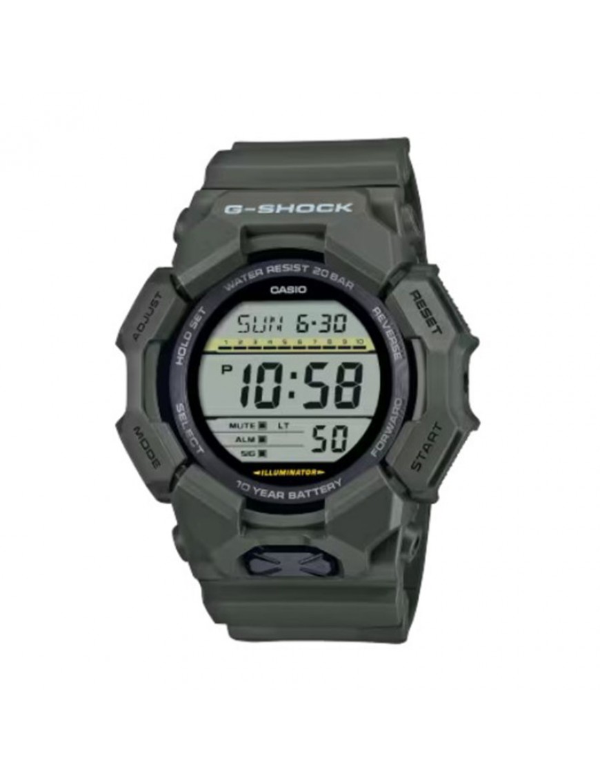 Reloj Casio G-SHOCK GD-010-3ER. Caja grande fabricada en resina de base biológica con estructura Carbon Core Guard, ofreciendo resistencia y menor impacto ambiental. Su diseño en verde militar con acabados oscuros le da un estilo robusto y versátil. Incluye pantalla digital amplia, hora mundial, cronómetro y luz LED de alta luminosidad, con acceso rápido mediante botón frontal. La batería de 10 años garantiza larga duración sin mantenimiento frecuente. Sumergible hasta 20 bares. Garantía de 3 años.