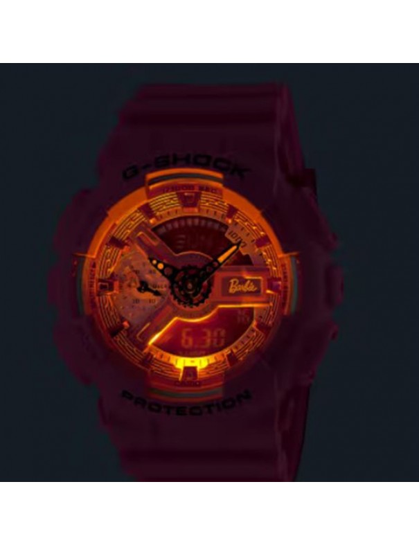 Reloj G-SHOCK x Barbie GMA-S110BE-4AER. Celebrando el empoderamiento femenino con un diseño en rosa brillante. Fabricado con resina de base biológica, combina resistencia a los golpes, resistencia al agua hasta 20 bares y luz LED para visibilidad en la oscuridad. Destacan el logotipo de Barbie™ y su icónica silueta en la esfera, correa y parte trasera. Garantía de 3 años.