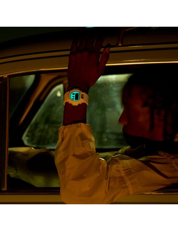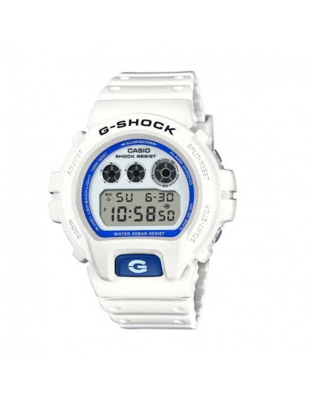 Reloj Casio G-SHOCK DW-6900HDS-7ER. Reloj fabricado en resina blanca con correa del mismo material y cierre de hebilla. La esfera azul fosforescente que evoca el brillo del plancton, pantalla digital con luz LED Super Illuminator, funciones de cronómetro, temporizador, alarmas múltiples y calendario automático, y una resistencia al agua de hasta 20 bares. Garantía de 3 años.
