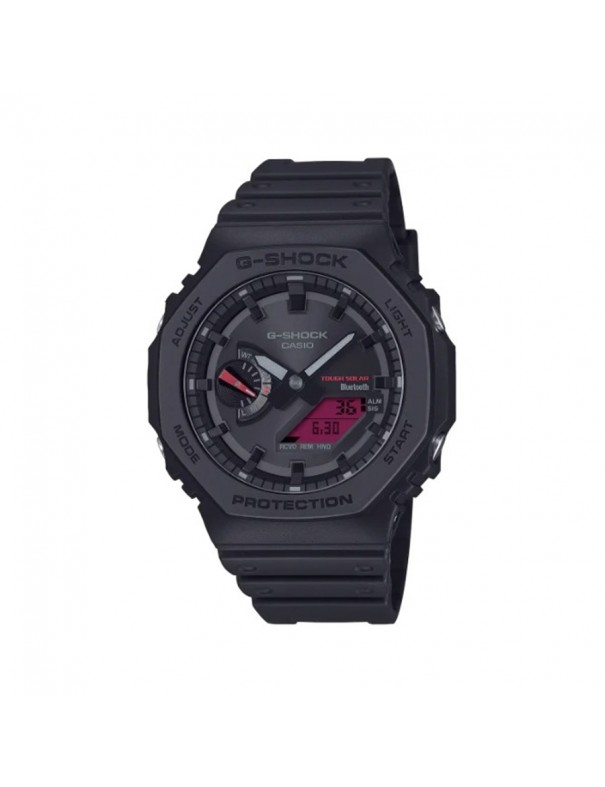 Reloj Casio G-SHOCK Classic GA-B2100BBR-1AER. modelo con caja de resina negra, correa de resina y cierre de hebilla, resistente a los golpes y al agua hasta 20 bares (200 m). Cuenta con energía solar estable, conectividad con smartphone para un manejo sencillo, pantalla con luz LED para visibilidad nocturna, cronómetro, temporizador, alarmas múltiples y calendario automático. Garantía de 3 años.
