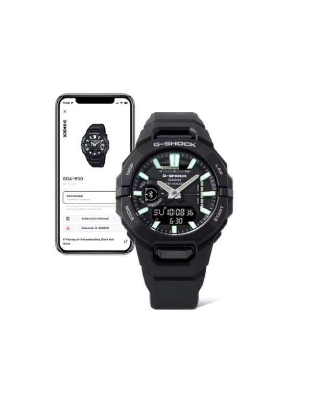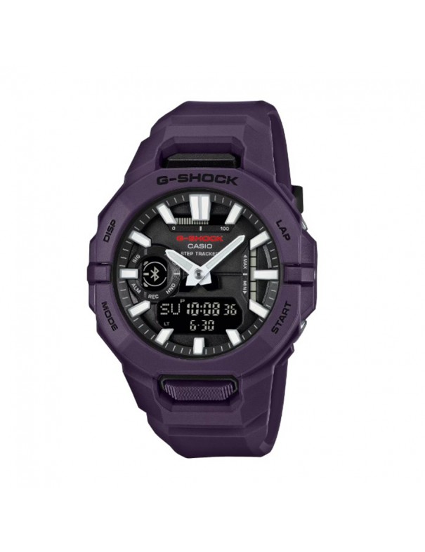 Reloj Casio G-SHOCK Serie G-SCUAD GBA-950-2AER. Caja de resina reforzada con fibra de carbono y correa de resina de base biológica con cierre de hebilla. Color predominante: morado/lila. Funciones: hora analógica y digital, conectividad Bluetooth con smartphone, seguimiento de pasos, conteo de calorías, cronómetro, temporizador de cuenta regresiva, 5 alarmas, luz LED doble, calendario automático hasta el 2099. Resistente a golpes, y al agua hasta 20 bar.