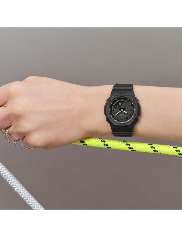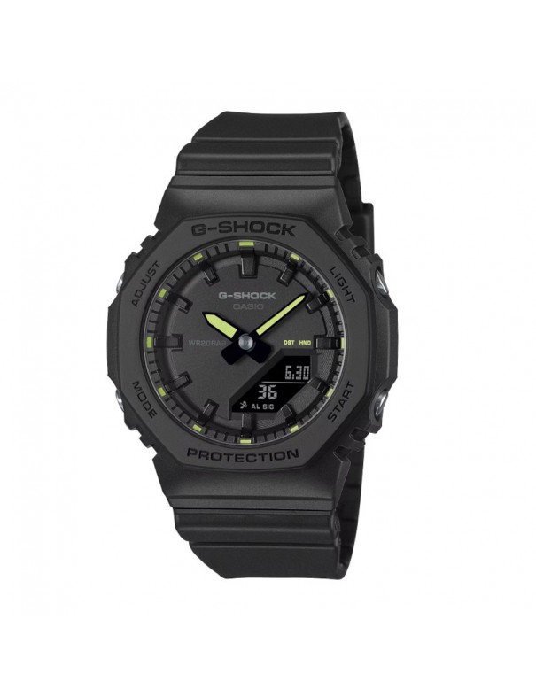 Reloj Casio G-SHOCK Classic GMA-P2100SA-1A2ER. Caja octogonal de resina biosintética negra con detalles en amarillo, correa de resina biosintética negra con cierre de hebilla. Funciones: hora analógica‑digital, hora mundial (31 zonas), cronómetro 1/100 s, temporizador hasta 24 h, 5 alarmas diarias, calendario automático hasta 2099, doble iluminación LED, resistente a golpes. Resistente al agua hasta 20 bar